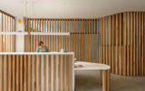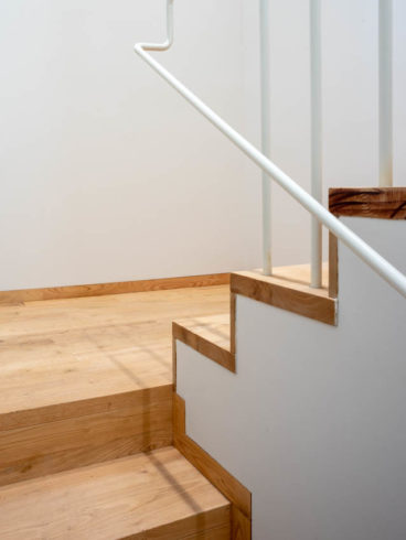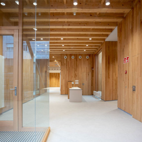 Para este hall amplio y luminoso buscamos una buena adecuación entre función y confort, tanto en el uso del mismo como a nivel perceptivo. Por tanto recurrimos a materiales naturales, nobles: paramentos de entablado de madera de roble y estructura de madera laminada de abeto, que en este caso queda vista.