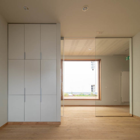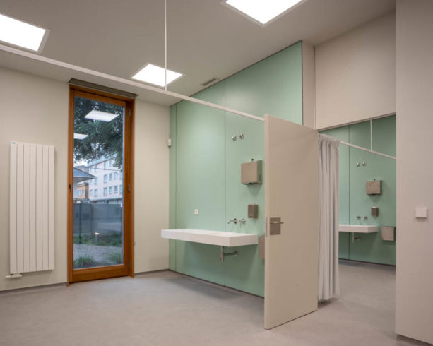 En esta zona de uso no sanitario modificamos los criterios de confort que pasan de primar la eficiencia higiénica a buscar un ambiente más doméstico. Trabajamos con suelos de tarima maciza de roble en salas, dormitorios y corredores. En los aseos se utiliza el PVC como único material continuo en pared y suelo.
