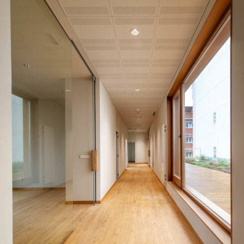 La zona de espera aparece como una rótula entre los espacios de comunicación. A continuación se organizan las consultas, oficios y almacén de medicamentos. Se trabaja en estos espacios con materiales continuos en techos, paramentos y suelos.
